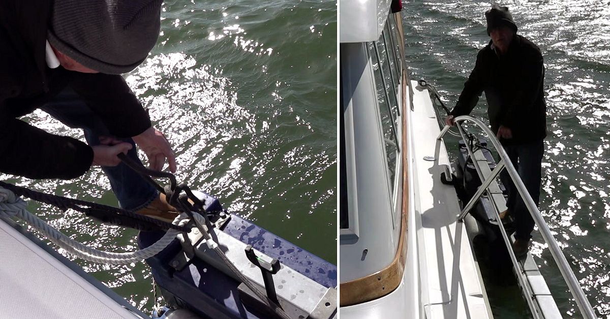 Här säkrar Kurt båten i Fiskebäck inför ovädret Dave
