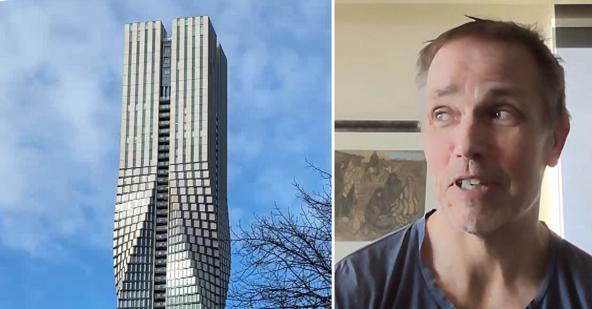 Den brittiska stormen Dave har fått Karlatornet att svaja. En av de boende som märkte av det var Johan Björkman, som bor på våning 62.